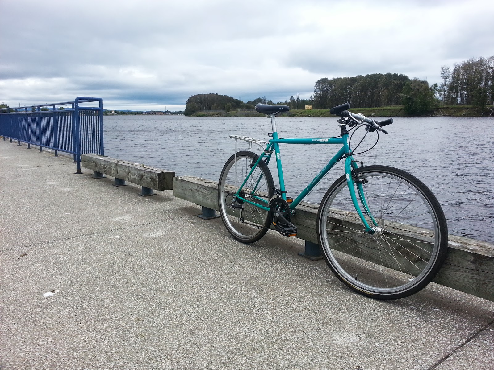 What began as a search for a reasonably comfortable ride for a long time friend, ended in a new commuter for me. Named for the colour which reminds me of Lake Louise. She currently has been outfitted with single speed rear wheel and studded winter tires.